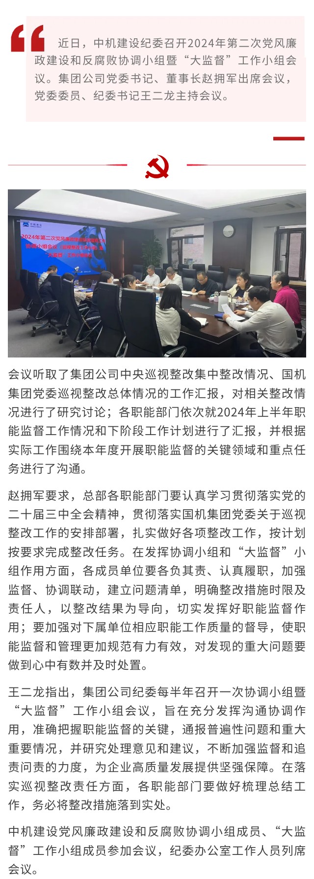 中機建設召開2024年第二次黨風廉政建設和反腐敗協(xié)調(diào)小組暨“大監(jiān)督”工作小組會議